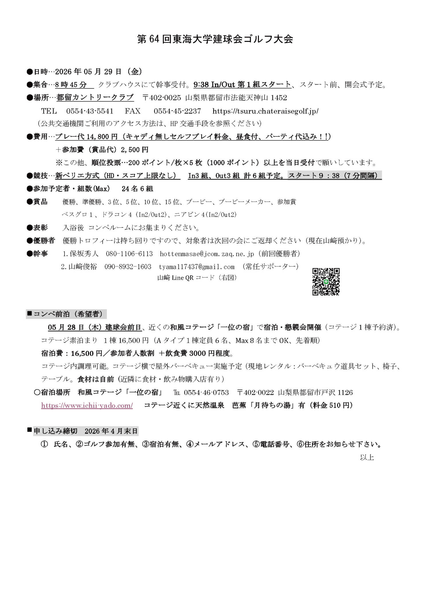 ① 氏名、②ゴルフ参加有無、③宿泊有無、④メールアドレス、⑤電話番号、⑥住所をお知らせ下さい。